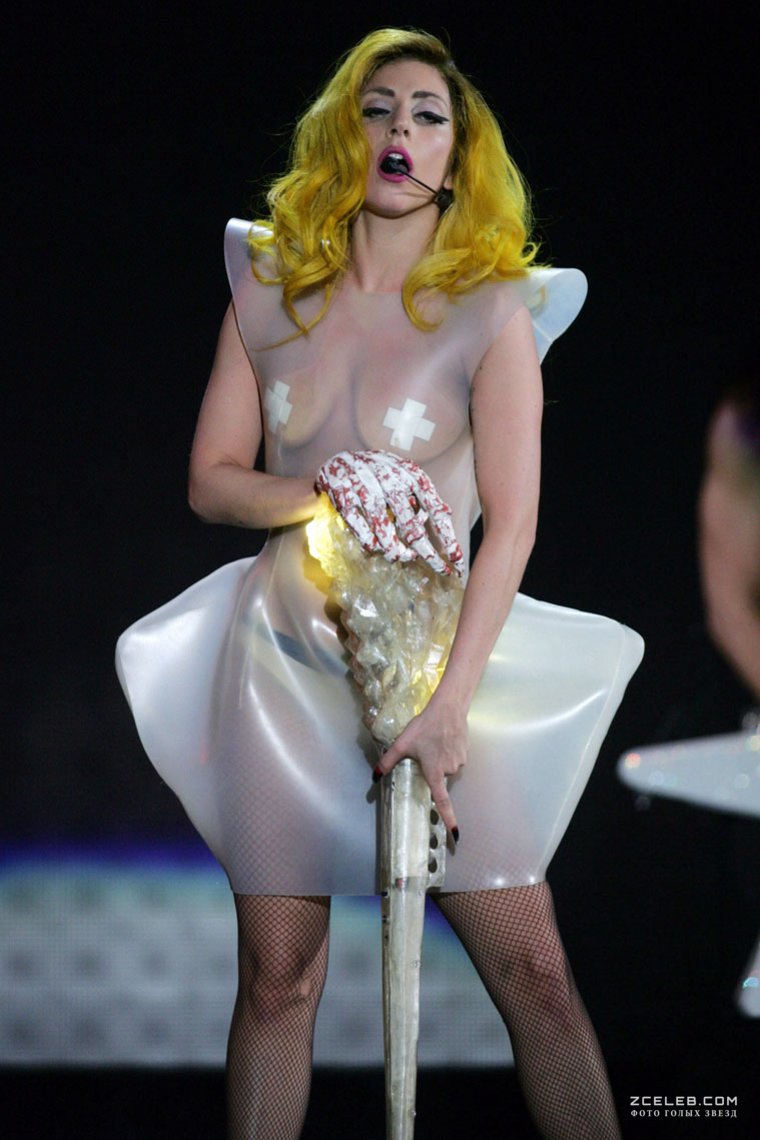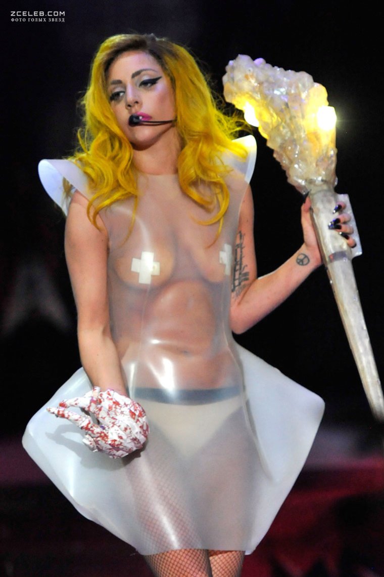 Певица Леди Гага с заклеенными сосками выступает на концерте в 2011 году.